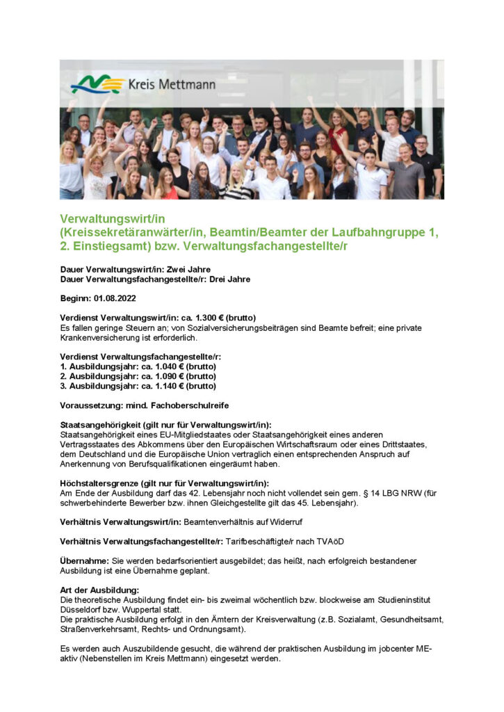 Bewerbungen werden ausschließlich über das Karriereportal und in deutscher Sprache angenommen. Bei technischen Rückfragen zur Online-Bewerbung wenden Sie sich bitte an ausbildung@kreis-mettmann.de.