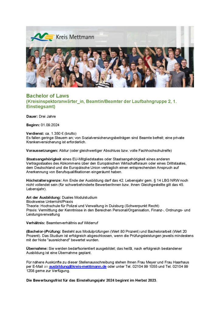 Für nähere Auskünfte zu dieser Stellenausschreibung stehen Ihnen Frau Capuano und Frau Haarhaus per E-Mail an ausbildung@kreis-metttmann.de oder unter Tel. 02104 99 1055 und Tel. 02104 99 1208 gerne zur Verfügung.